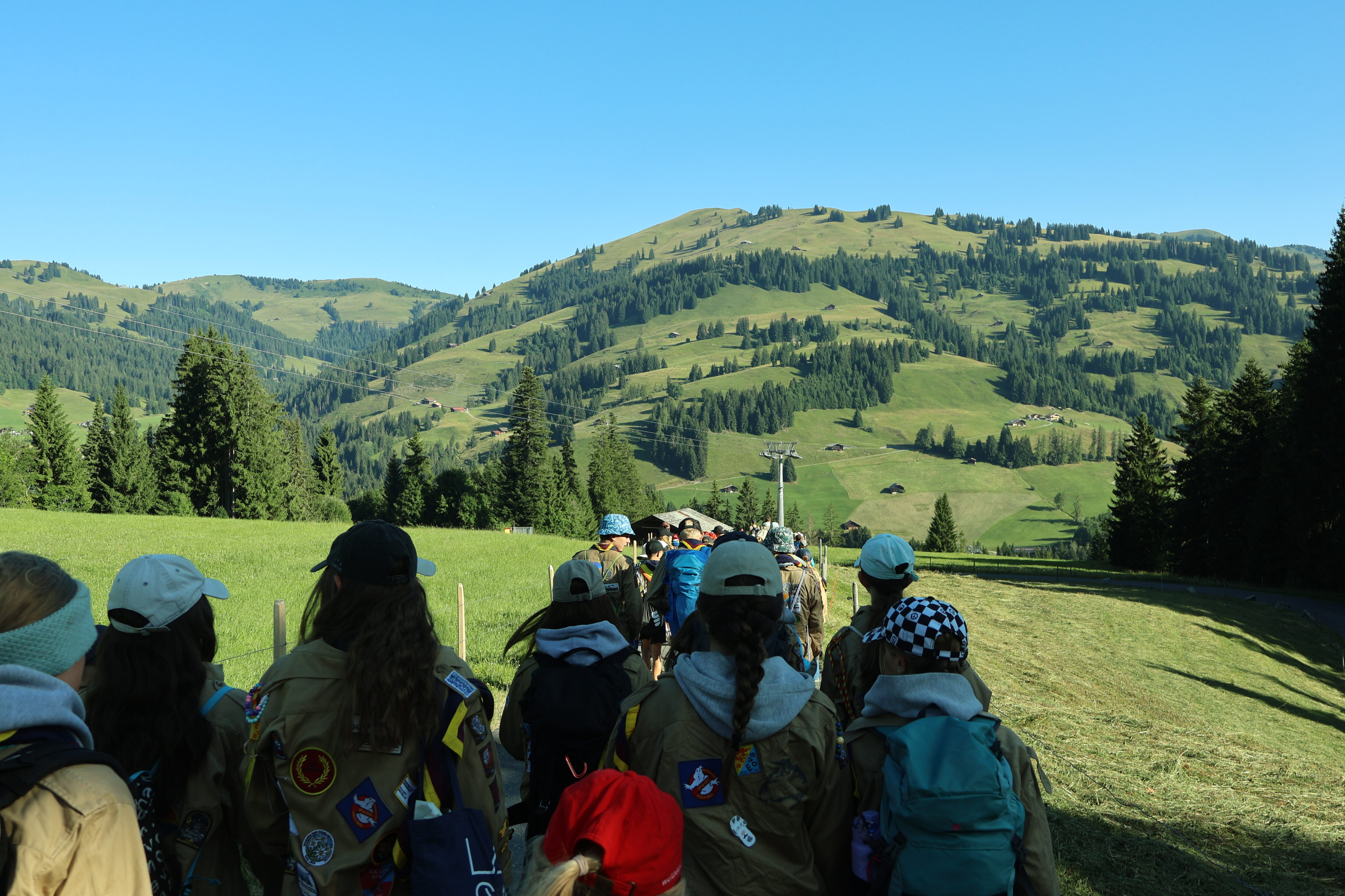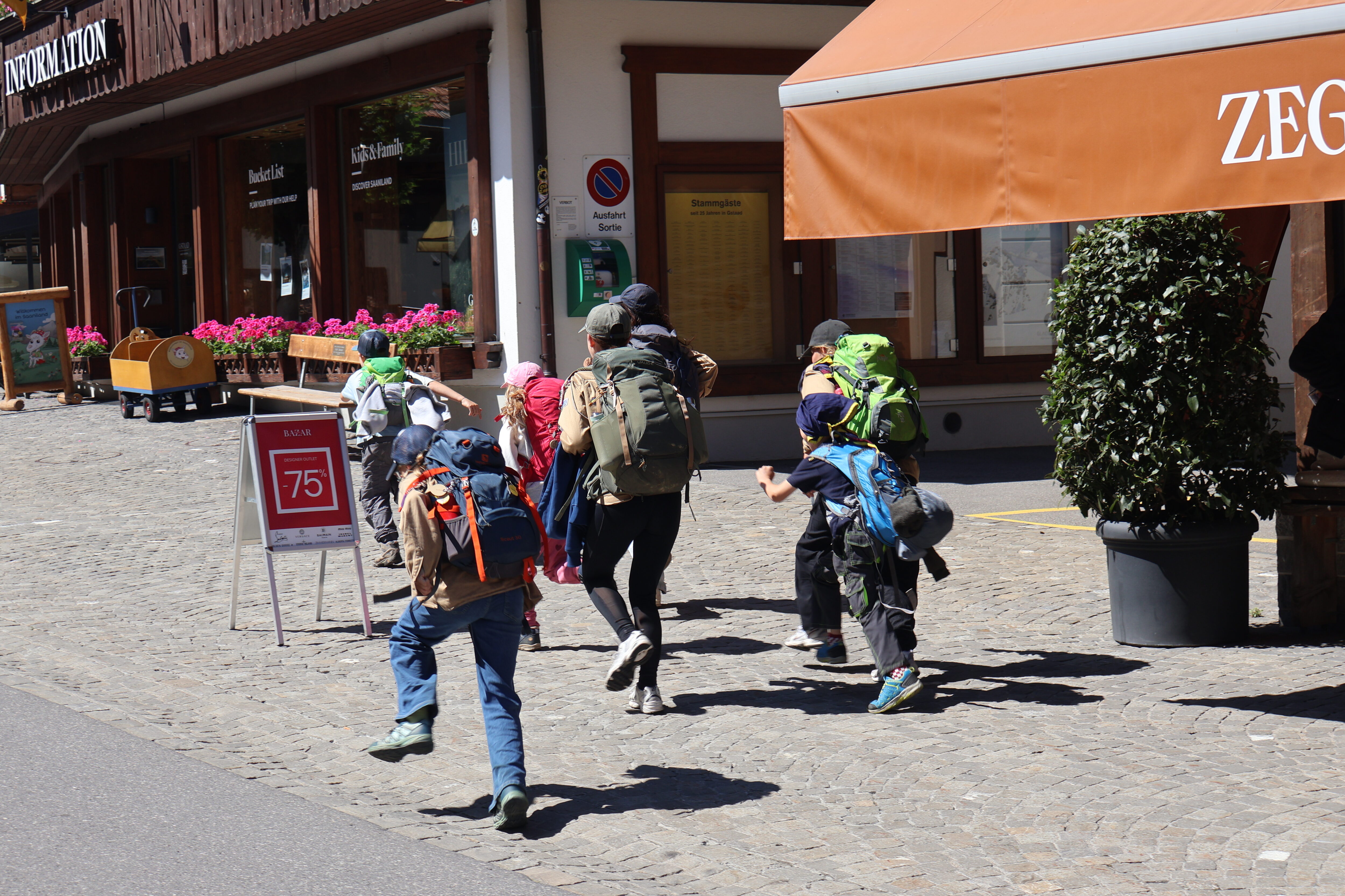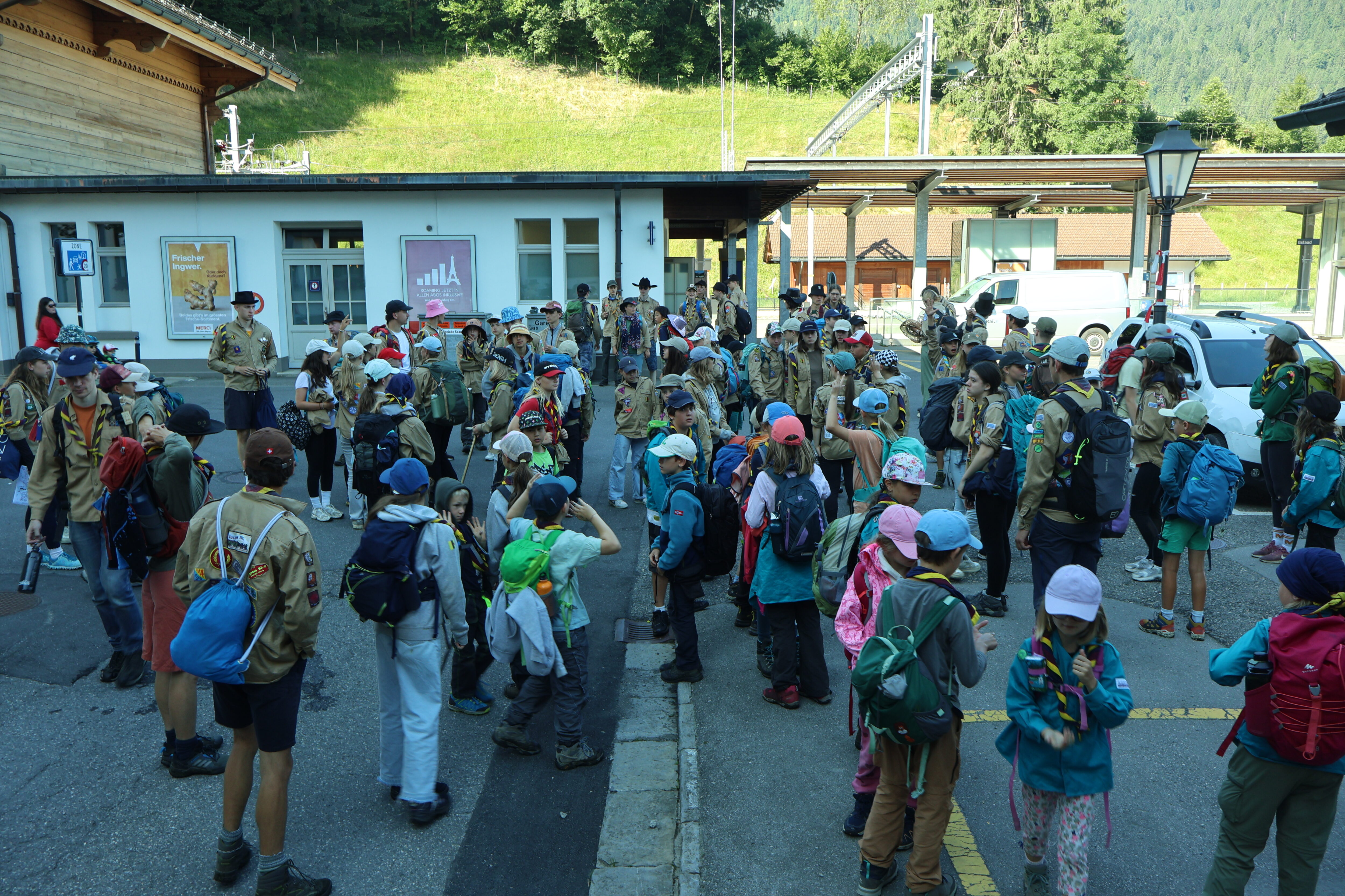 Wir beschlossen, ihm zu folgen, und machten uns sofort auf den Weg. In den drei reservierten Waggons unseres Dampfrosses fuhren wir gemeinsam mit der Pfadistufe in Richtung Gstaad. Dort angekommen, warteten drei Gehilfen des Sheriffs auf uns und erklärten, dass sich die gesamte Diebesbande von Averell im Dorf herumtrieb. Aber Obacht, wer ihnen begegnete, musste mit üblen Konsequenzen rechnen. Zum Beispiel zehn Hampelmännern. Im Dorf hielten sich aber auch einige Freunde und Bekannte des Sheriffs auf. Sie wollten uns helfen, den bösen Averell zu schnappen.